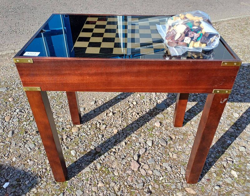 Hardwood games table with reversible glass inset top & metal fittings includes - chess pieces, drafts pieces & various other game pieces