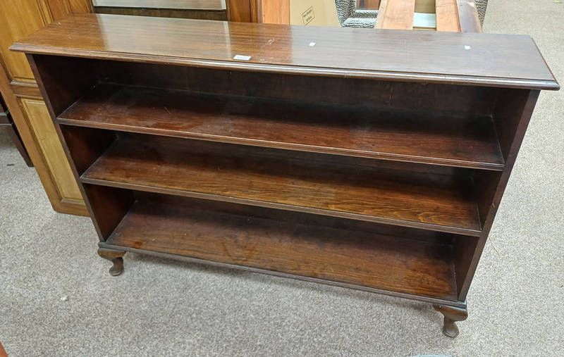 20th century mahogany open bookcase on short queen anne supports