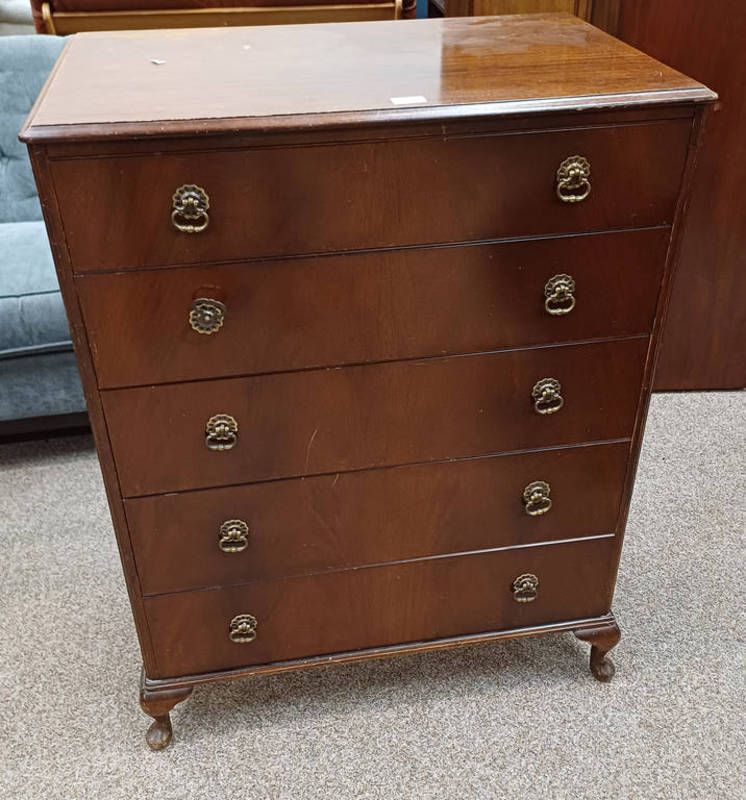 20th century beithcraft mahogany chest of 5 long drawers on queen anne supports - 101 cm tall x 78 cm wide