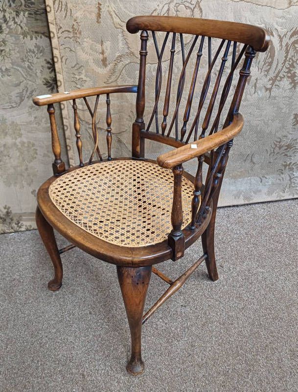 Early 20th century liberty company beech armchair with decorative back & bergere seat on shaped supports - makers plaque to underside