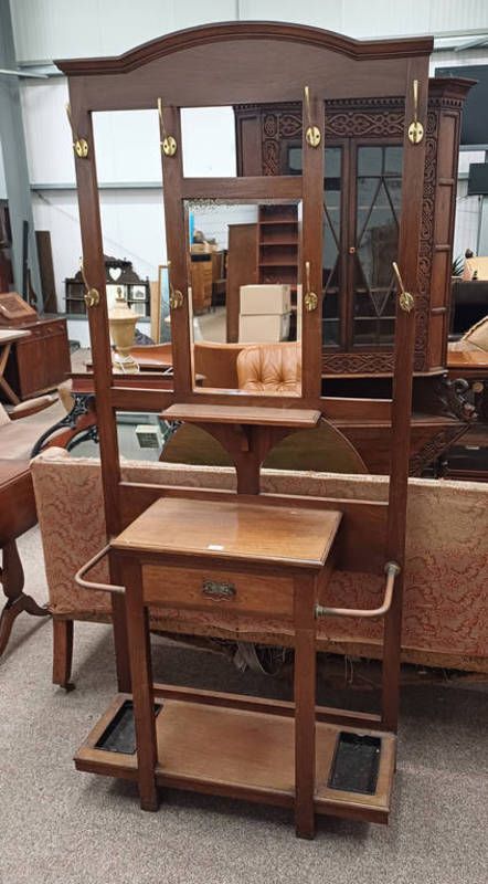 Early 20th century mahogany mirror back hall stand with single drawer on square supports. 209 cm tall