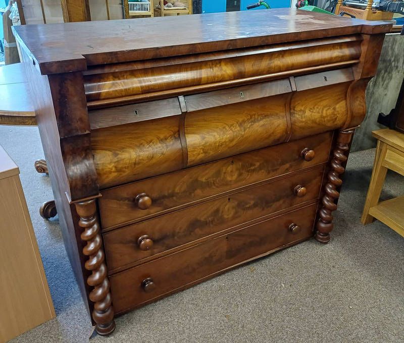 19th century mahogany ogee chest with 3 short over 3 long drawers with shallow long drawers above & barley twist decoration - base missing - 110.5 cm tall x 130 cm wide