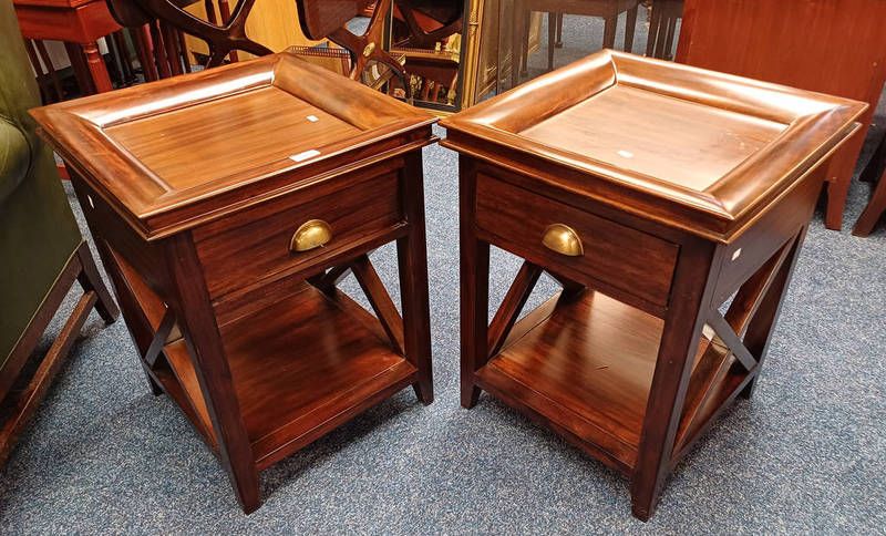 Pair of hardwood single drawer lamp tables on x frames