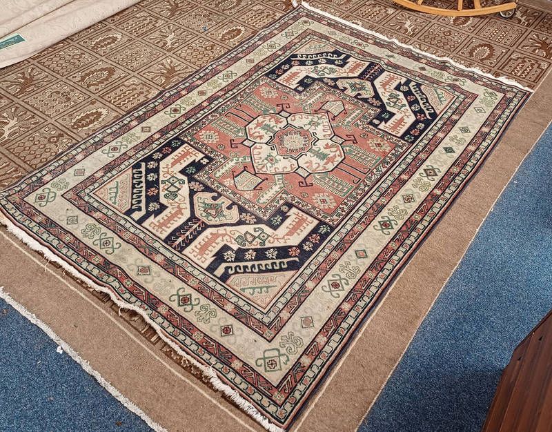 Middle eastern style carpet with gold, red & blue pattern 228 cm long x 156 cm wide