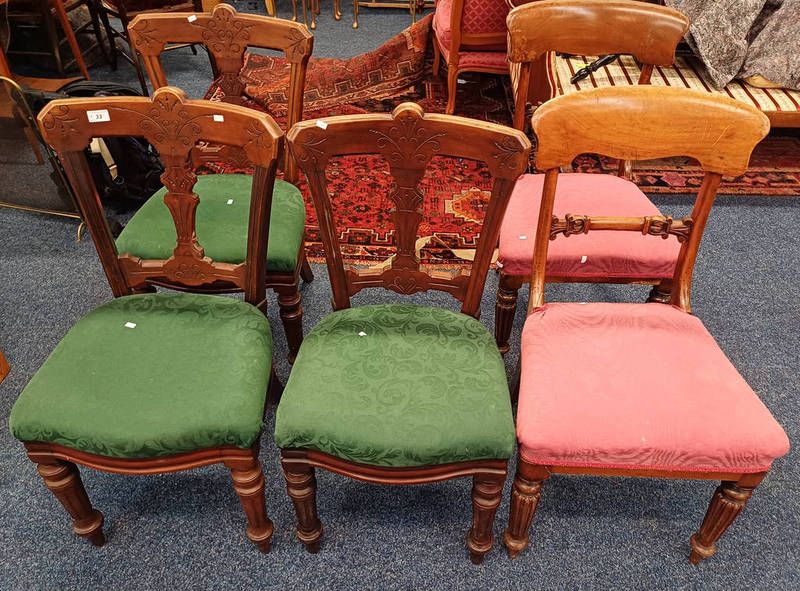 Set of 3 19th century mahogany dining chairs on reeded supports stamped j reilly's patent to underside & 2 other chairs