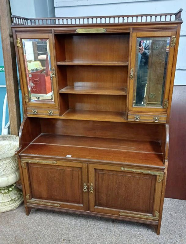 Mahogany cabinet with gallery top over 2 mirror panel doors over 2 drawers with shelved centre section over 2 panel doors, length 120cm