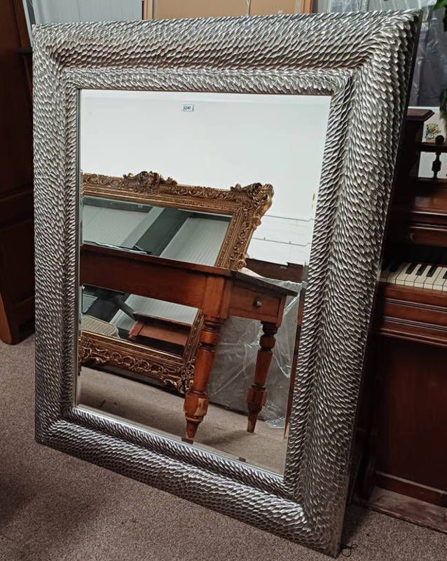Large rectangular mirror with bevelled edge & decorative silvered frame - glass dimensions : 104 cm x 79 cm