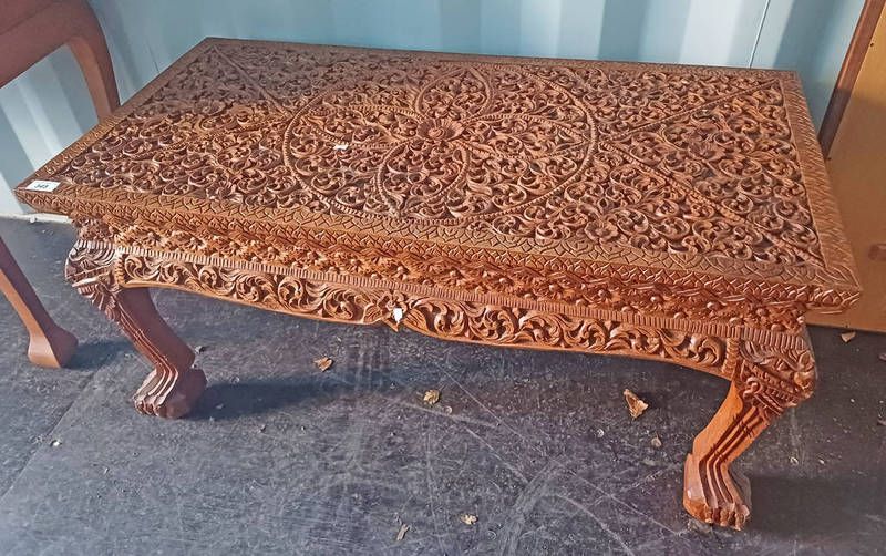 Eastern hardwood carved coffee table on ball & claw supports - 51 cm tall x 103 cm long x 52 cm wide