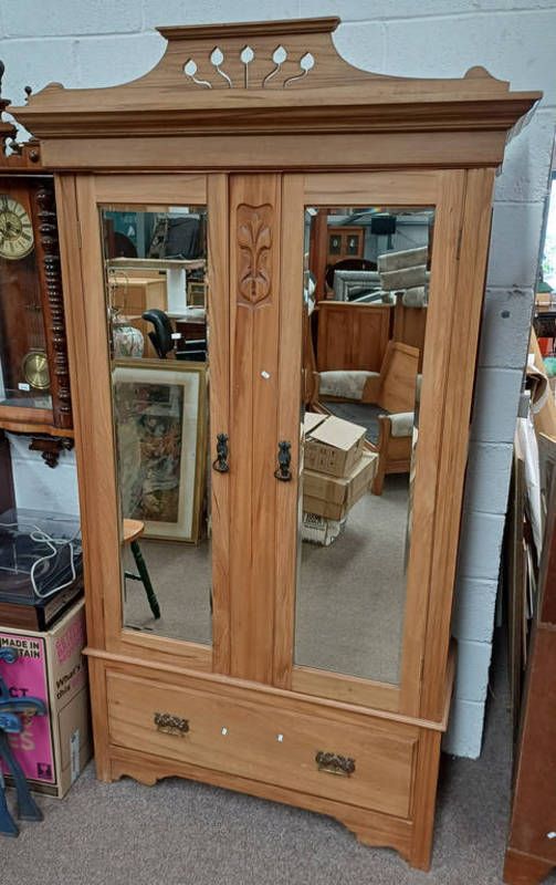 Pine 2 mirror door wardrobe with single drawer to base n the art nouveau style - 215 cm tall