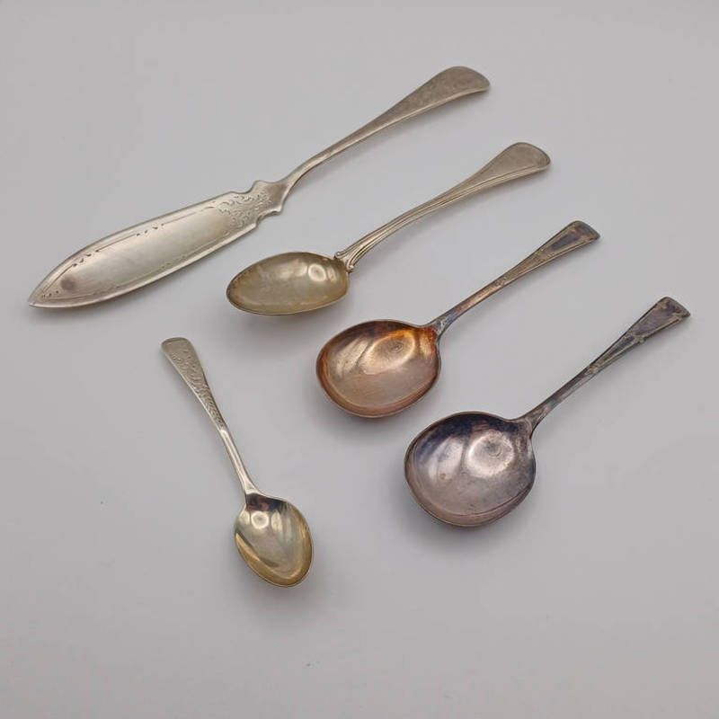 A silver butter knife by john sanderson, sheffield 1908 & 4 silver spoons. 123g