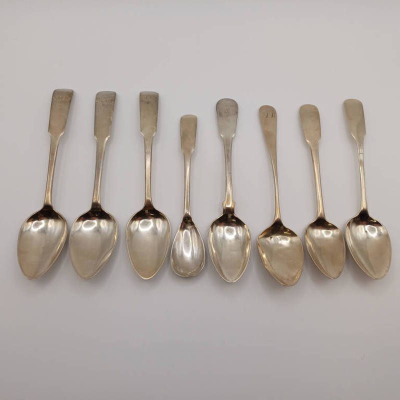 7 georgian scottish silver teaspoons & 1 salt spoon from various makers & dates to include a set of 3 by andrew wilkie, edinburgh 1812. 101 g