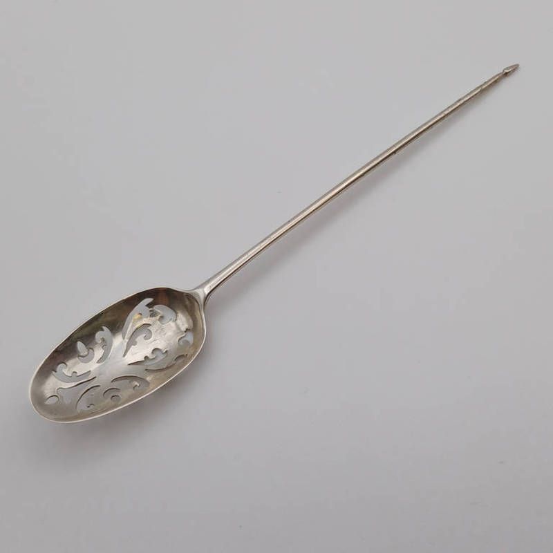An 18th century silver mote spoon with decorative pierced bowl, marks rubbed