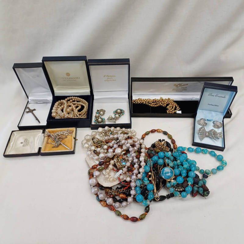 Gilt metal chain, reindeer brooch marked sterling silver marcasite set brooch & earrings, 925 silver chain - 74 cm rolled gold bangle etc