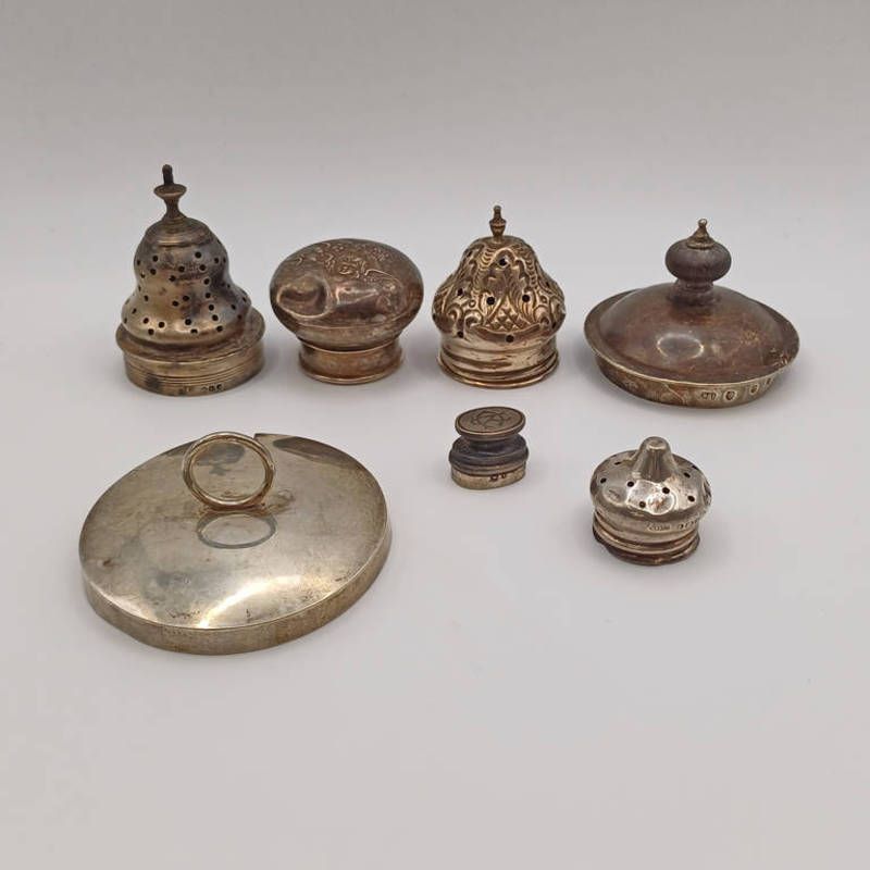 Hallmarked silver cherub decorated scent bottle top birmingham 1903 & various other silver tops, 125g