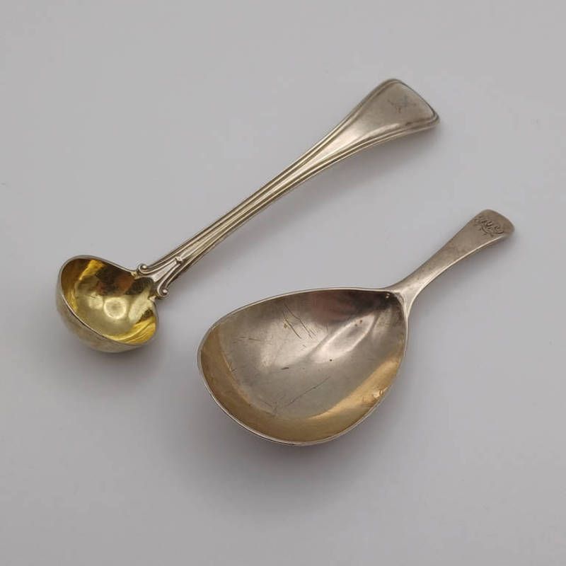 A georgian silver caddy spoon by richard crossley, london 1796 & a small silver ladle by h j lias & son, london 1856. 37g