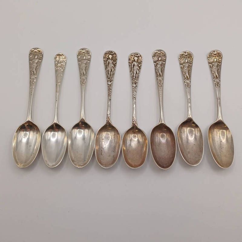 Matched set of 8 georgian silver teaspoons with picture back and with stem decoration, various marks - weight 117 grams