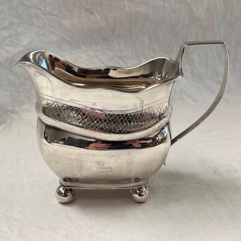 George iii irish silver cream jug with engraved decoration on 4 ball feet by richard sayer, dublin 1808 - 170 g