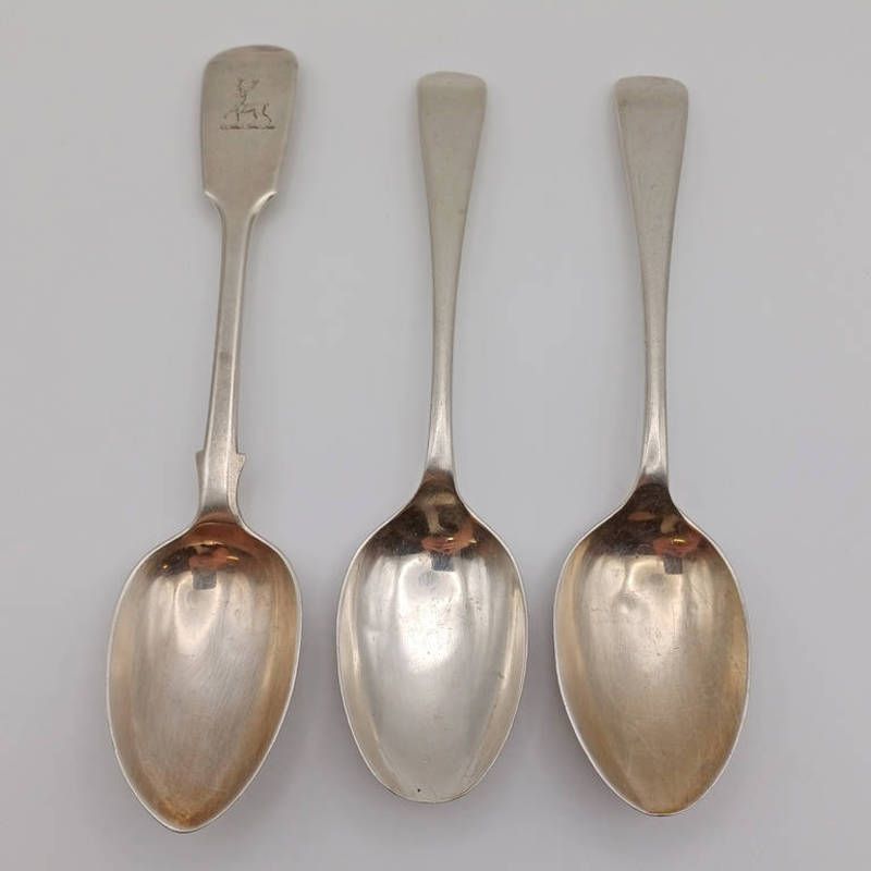 3 silver dessert spoons to include a pair by martin hall & the other by josiah williams & co, exeter 1859, 146g