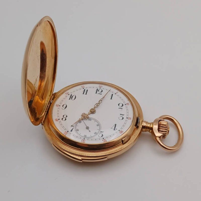 Late 19th / early 20th century 14k gold hunter cased quarter repeater pocket watch with white enamel dial & subsidiary seconds dial - case 54 mm diameter, total weight 104.7g