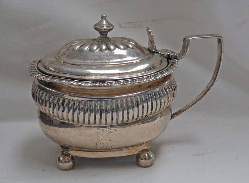 George iii silver mustard pot with blue glass liner on ball feet, london 1817. 188g