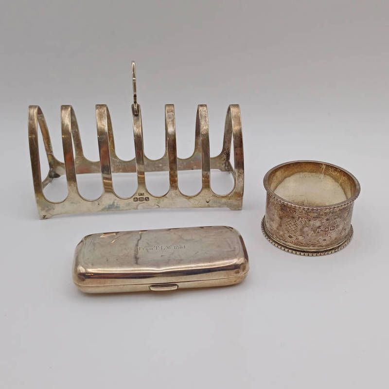 A silver 7 bar toastrack by viners ltd, sheffield 1936, a silver cigarette case with gilded interior & a silver napkin ring, 147g