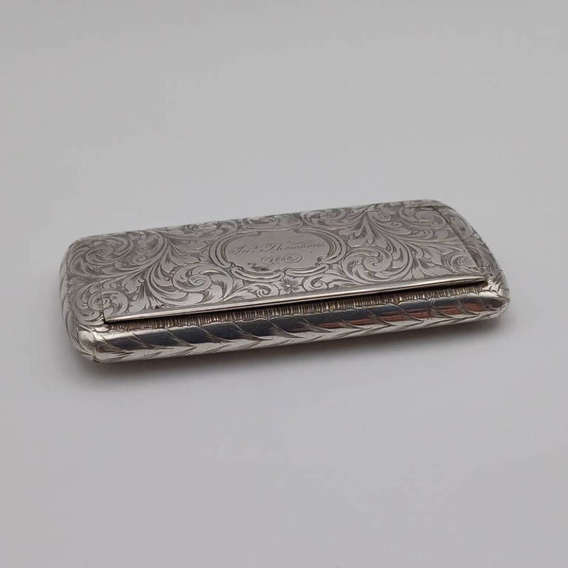 A victorian silver snuff box with engraved foliate decoration, the lid inscribed jas thomson 1855 by david pettifer, birmingham 1853, 7.7cm wide