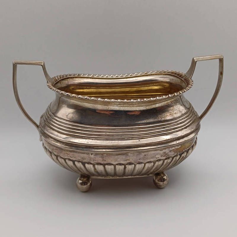 A large silver two handled sugar bowl with half fluted decoration & a gadrooned border on 4 ball feet by henry stafford ltd, sheffield 1910, 18.5cm wide, 301g