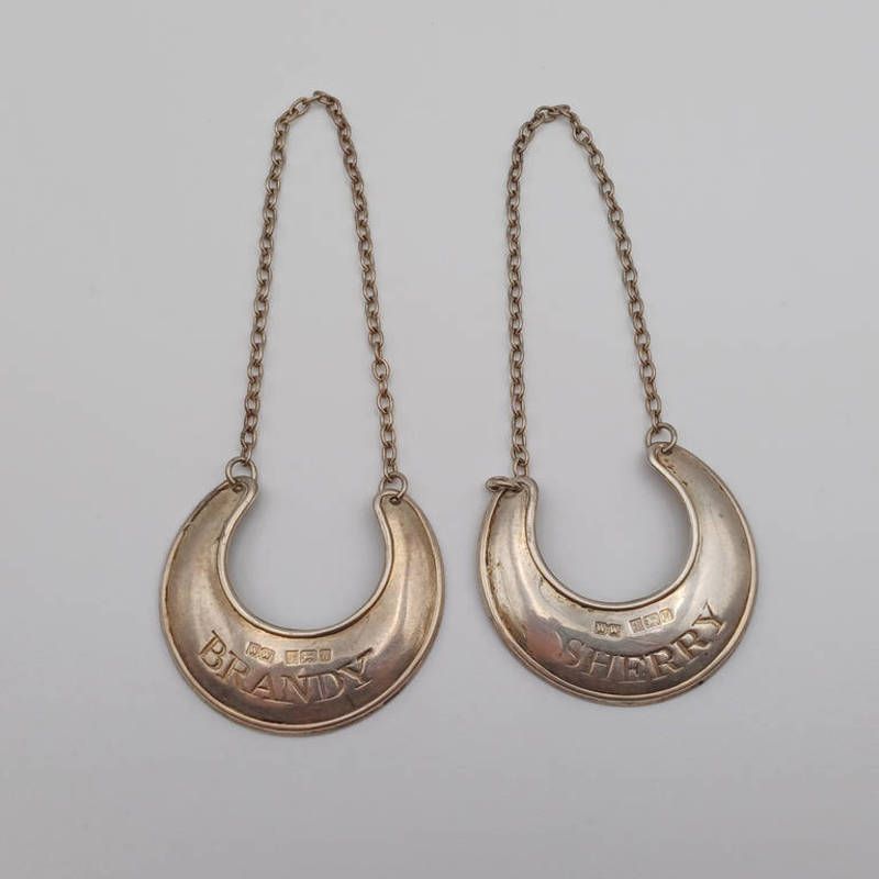 A pair of silver crescent shaped decanter labels: sherry & brandy by w w, birmingham 1987