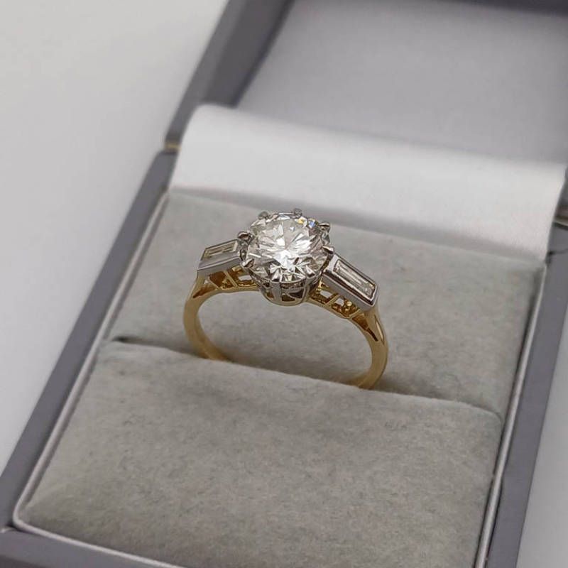 Art deco 18ct gold diamond single stone ring, the transitional cut diamond approx 1.44 carats set between 2 baguette cut diamonds - ring size k 1/2