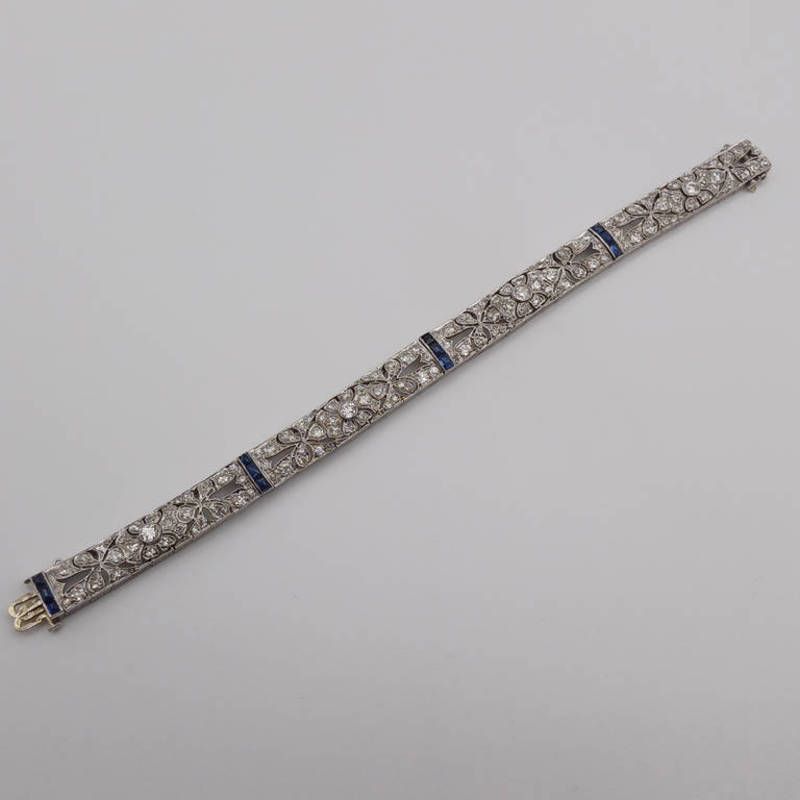 Early 20th century art deco platinum set sapphire & diamond bracelet set with circular cut diamonds & faceted cabochon sapphires in pierced floral links- 18.7 cm long