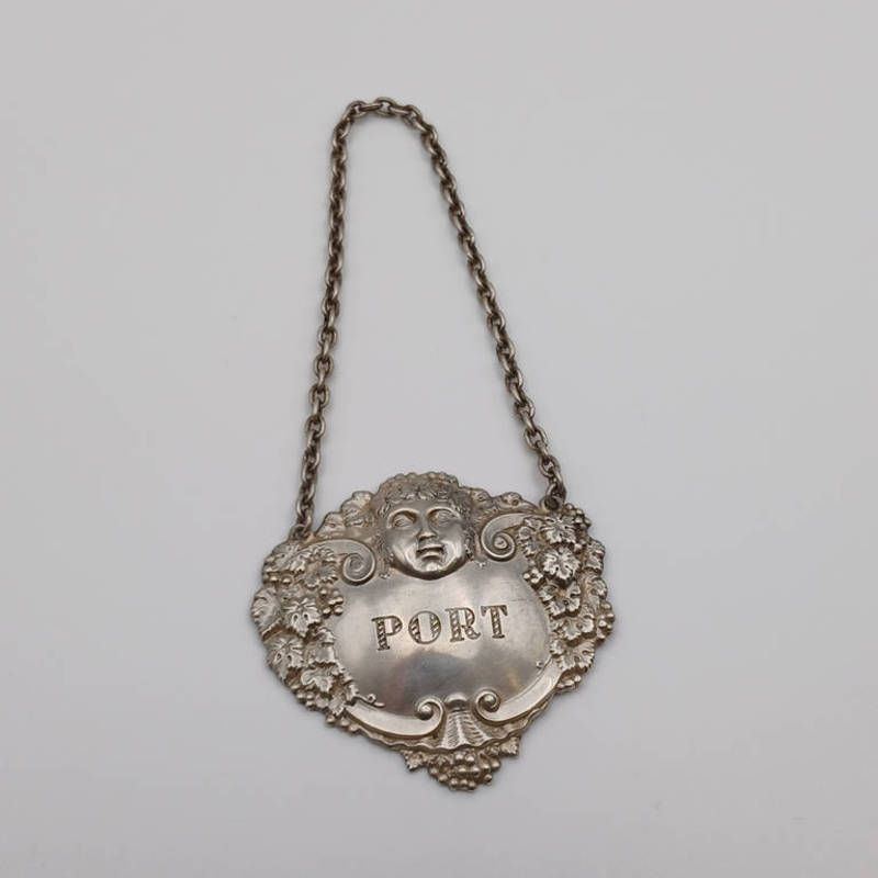 A silver decanter label for port with embossed cherub & leaf decoration by turner & simpson, birmingham 1959