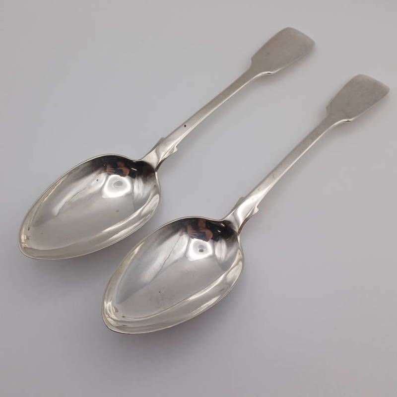 A pair of victorian silver fiddle pattern tablespoons by john harris , london 1839. 127g