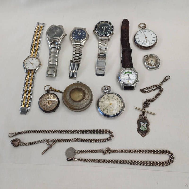 Silver openface pocket watch, 935 silver fobwatch, 3 silver watch chains, various wristwatches, etc