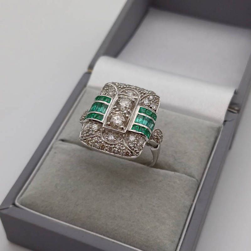 Art deco style 18ct gold emerald & diamond ring, pair of brilliant cut diamonds approx 0.5 carats in total set within a surround of brilliant cut diamonds, & step cut emeralds - ring size n