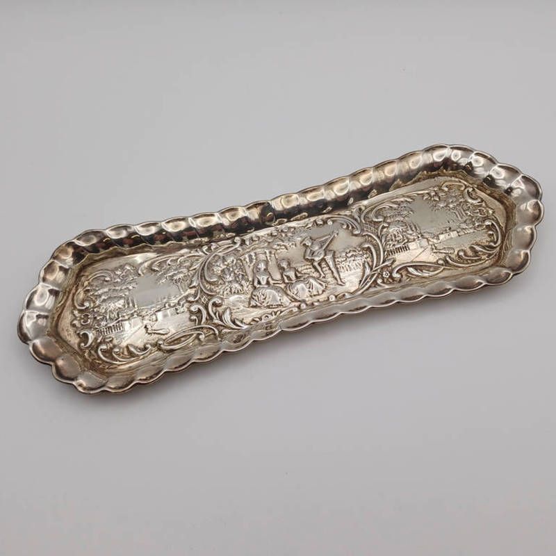 A silver trinket tray with figural scene of 2 women & a lute player with embossed decoration by henry matthews, birmingham 1903, 21.5cm long, 60g