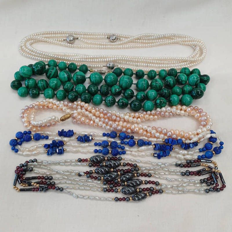 Pearl & lapis bead necklace, triple strand baroque pearl necklace & one other pearl necklace. green malachite bead necklace. length 86 cms all with magnetic clasps
