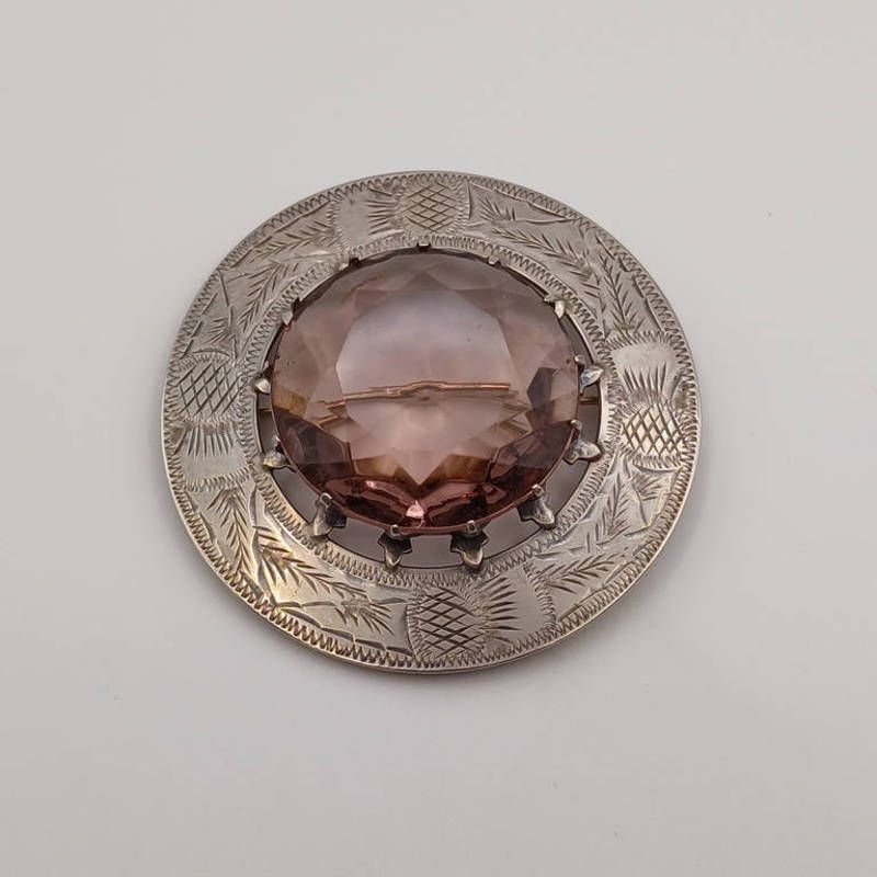 Circular hallmarked silver amethyst set brooch with engraved thistle decorated, birmingham 1965