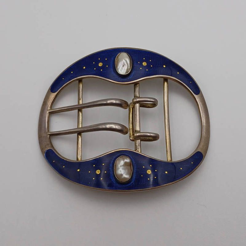 A continental silver & dark blue enamel buckle with gilded decoration & set with 2 mother of pearl cartouches, marked depose sterling to rear, 8.5cm wide