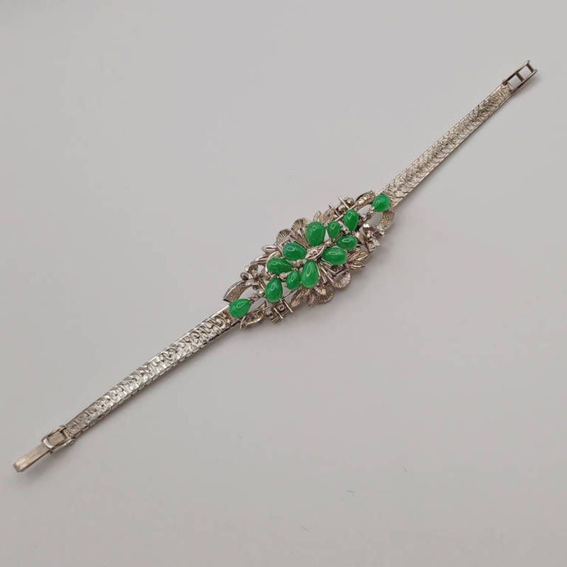 18k gold green hardstone set floral spray bracelet - weight 24.2 grams, 18 cm long