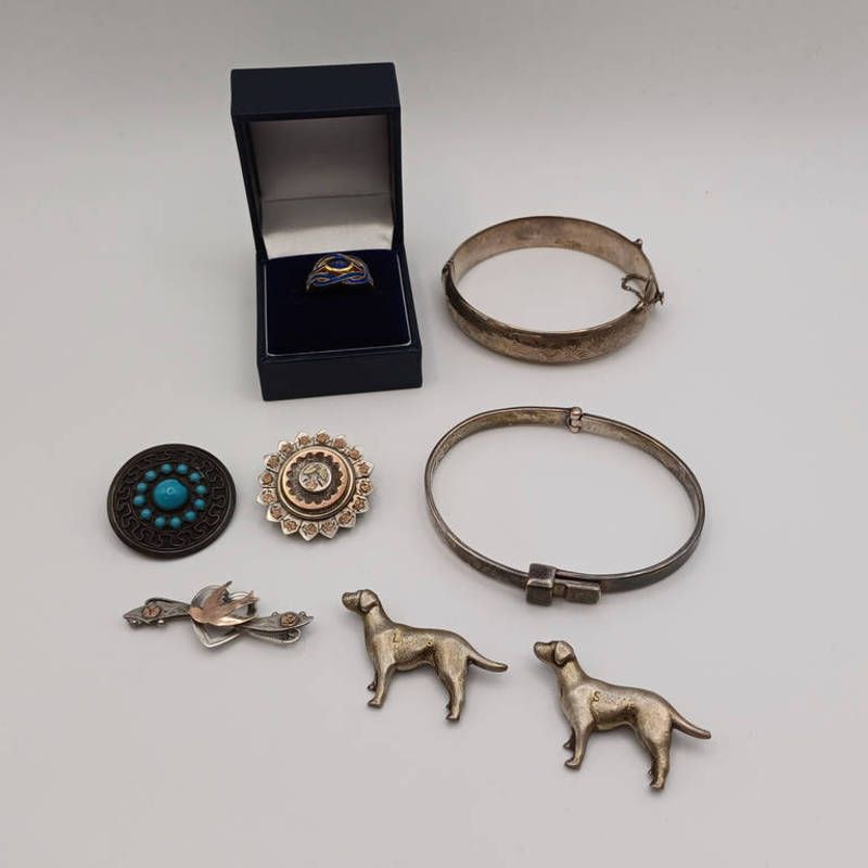 2 silver hinged bangles, 2 silver dog brooches, white metal & turquoise circular brooch, etc