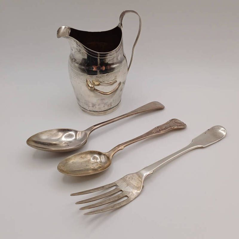 Hallmarked silver jug mark rubbed, possibly robert rew circa 1760, silver dessert spoon, sheffield 1905, one other edinburgh 1896, silver fork, london 1856. weight 230 grams