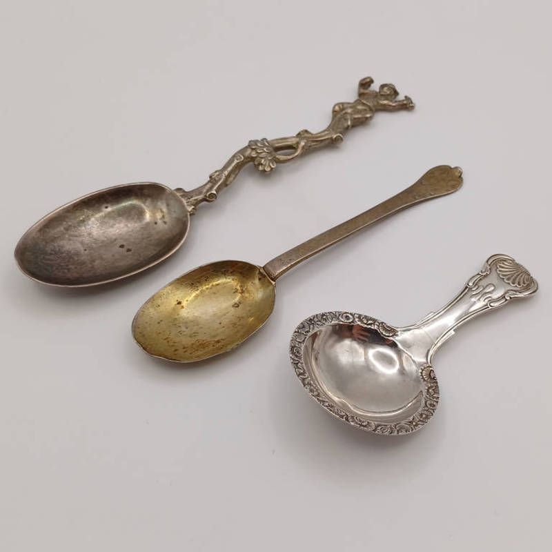 Silver spoon with decorative handle, london 1887, silver teaspoon, london 1918, silver caddy spoon, birmingham 1819 - 80 grams