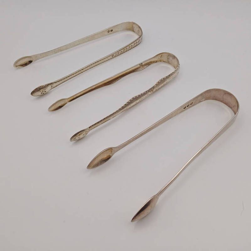3 pairs of georgian silver sugar tongs by samuel godbehere & edward wigan, solomon houghham, solomon royes & john east dix & william skeen. 90g