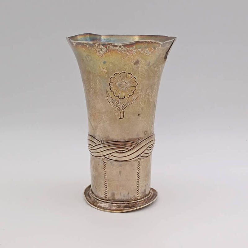 A white metal beaker marked artificers guild 9 maddox street london, 79g