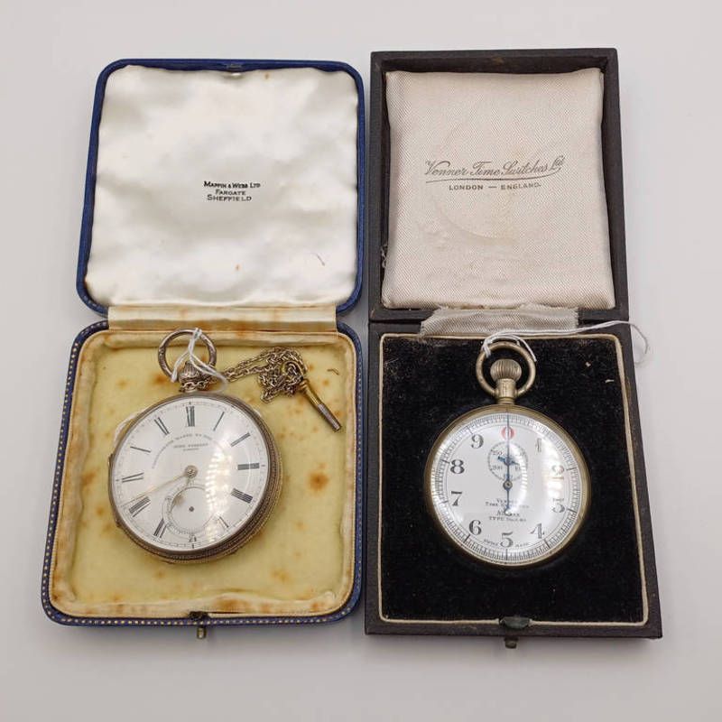 Venner time switches ltd stop watch, no 8215, type no a 40 in fitted case & silver pocket watch by john forrest, london