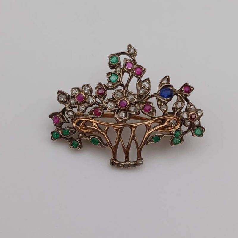 Late 19th / early 20th century gold & silver giardinetto brooch set with rose cut diamonds, rubies, emeralds & sapphire - 3.8 cm wide, 5.8 g