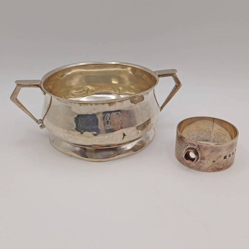 Silver 2 handled bowl (distressed) birmingham 1934, weight 140g, silver napkin ring, edinburgh 1922 (stone missing), weight 48g