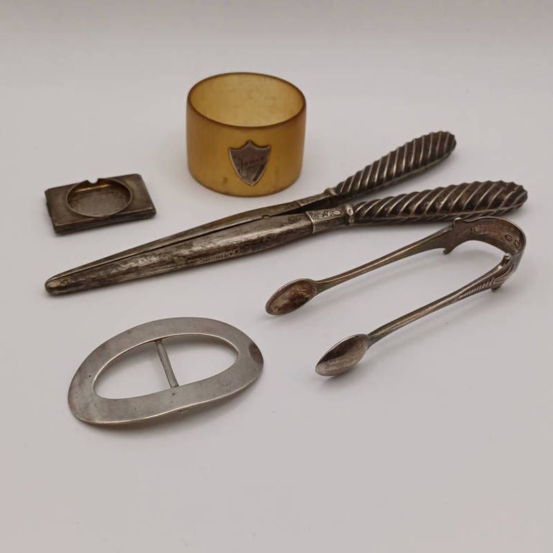 Pair of silver handled glove stretchers, birmingham 1900, silver watch case, pair of silver tongs, london 1892, silver buckle, edinburgh 1908, silver mounted horn napkin ring