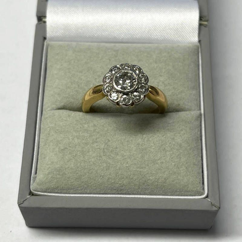 18k gold & platinum diamond cluster ring, the central diamond of approx 0.36 carats set within a surround of 10 brilliant cut diamonds, size l 1/2