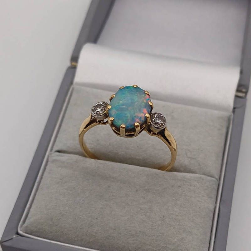 18ct gold opal doublet & diamond 3-stone ring, the diamonds approx 0.2 carats in total - 3.1g, ring size t